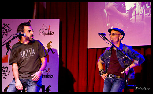 En cuanto a la colaboración de Fito en discos de grandes artistas, Fito considera que es realmente lo que merece la pena. Con 15 años, él conocía a uno que conocía a Rosendo y le parecía la polla… ahora además tiene la ilusión de poder colaborar con gente que son grandes amigos como Rosendo o MClan, destacando a este primero ya que él se dedica a esto gracias a Rosendo, a ese tío que le ofrecen colaborar en una versión suya, se la destrozan y encima viene a cantarla, ese que te ofrece su escenario para tocar Flojos de pantalón… Se le nota la ilusión hablando de Rosendo. Destaca un vídeo en youtube, con el que mucho se ha reído en el que tras el solo de este tema se oye a alguien del público decir “ese es mi Fito y no la mariconada que hace ahora”. Asegura entre risas que le encanta y le manda un saludo al autor del vídeo. Respecto a “Lo que siempre quise hacer”, ¿es este el disco que Fito siempre quiso hacer? Pues sí y no. La satisfacción con el disco está ahí, es el 15 ó 16 que hace, el más importante porque lo ha grabado con sus amigos, pero no está descontento con ninguno de sus anteriores trabajos. Sí que es un disco que tiene mucho esfuerzo por lo que todo conlleva, pero ha sido fácil y cómodo de grabar por todo el que lo ha hecho posible, entre ellos Carlos Raya, que contagia el amor por todo lo que hace. Sin presión, porque antes, aunque tampoco la había, la sentía. Ha habido quien en el público ha notado que es el disco menos Fito, con sonidos más de los años 60 o 70, que recuerdan más a Platero que a Fito, como que huye del estilo de los últimos discos. Fito, con cara de sorpresa y nuevamente entre risas, dice que huye, pero que no sabe de qué. Sí está de acuerdo en que hay canciones que pueden ser más continuistas y otras que pueden ser más plateriles, pero ante todo son más simples y sencillas, que era lo que realmente buscaba, dejando que desemboque por sí misma la idea. Considera igual que el haber grabado con la banda de la gira lo ha hecho todo mucho más fácil. Y… Huyendo conmigo de mi… ¿Hacia dónde huye? Pues simplemente hacia donde está mejor. Realmente no era la primera idea de título para el disco, sólo es una frase de una canción que va acompañada de otras muchas frases. La primera idea de título era “Pájaros disecados”. Concluye con “¿Nadie ha entendido nada? Yo tampoco”. Vamos con tres preguntas en una, a cada cual más complicada. La primera ¿A qué crees que se debe tu éxito mediático? Pues no lo entiende igual que no entiende por qué le gusta Rosendo o Noel Gallagher. No siempre tiene que gustarte el mejor guitarrista o el mejor cantante o el más guapo, simplemente hay veces que se conecta con algo y canciones que no se pueden dejar de escuchar y artistas que siempre se quieren ver. Atención que acaparan determinadas personas que es lo que hace mágica a la música. Se puede inventar un éxito, pero eso no llena las Ventas. Segunda ¿Compones siguiendo lo que quieres, lo que te impone la discográfica…? “Yo compongo lo que puedo. A veces me sobrevaloráis. Yo hago la música que deseo hacer. La que no llego a hacer es la música que me gustaría hacer. No existe nadie que pueda grabar discos o estar en el rock and roll si el público no lo aguanta. El rock and roll valora el trabajo de una persona y no es como poner galones en el ejército”. La tercera ¿Qué arropa más al corazón, haber tocado en una banda de culto o tocar en una banda mediática? Le arropa la música que hace en el momento, porque ninguna banda es una banda de culto en el momento, el culto viene después. Define también su época de Platero como que nadie sentía ser una banda de culto porque eso ni se había inventado, igual que cuando empezó con Fitopaldis tampoco se sentía mediático porque empezaron por salas pequeñas. Lo que le gusta es la libertad de poder hacer la música que quiere en el momento que quiere. |