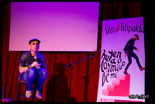 Puede que si eres un gran seguidor de Fito, ya tengas su nuevo álbum “Huyendo conmigo de mi” en las manos, pero si todavía no has tenido la ocasión de hacerte con él, vamos a contarte un poco lo que vas a encontrarte en el disco y en la gira. Es el propio Fito quien responde a todas las dudas de los medios en la rueda de prensa que ha tenido lugar en la mítica y céntrica sala “El Sol” de Madrid. Comenzamos la velada con una escucha del disco acompañada de las imágenes del documental que complementa la edición de 10 temas, unos 50 minutos aproximadamente. ¿A qué suena? Pues suena a Fito. Puede parecer una descripción un tanto vacía, pero el que conoce su trabajo, sabe a lo que me refiero, a esa unión de rock urbano con rock americano con sus toques característicos pero probablemente más sencillo y a la vez más crudo que en discos anteriores. Sin embargo, tras cinco años sin poner un cd en las estanterías, no vamos a entrar más en valoraciones personales y eso lo dejamos a juicio de cada uno, que es lo que realmente importa. Eso sí, si algo es de agradecer, es poder escuchar el disco leyendo la nota de prensa redactada por el propio Fito y en la que canción por canción, a modo de misiva a sus seguidores, cuenta todo el proceso de creación de este nuevo plástico. En este caso es cierto que nadie mejor que un padre para hablar de su hijo. Vamos con la rueda de prensa. Empieza a las 19.15, bastante puntual, cuando Fito Cabrales se sienta en un taburete en el escenario, acompañado de Miguel Ángel Hoyos de TVE y Radio Nacional, que hace las veces de anfitrión y conductor. Es este mismo quien rompe el hielo contando tres míticas anécdotas suyas que tienen como protagonista a Fito. La primera de ellas viendo a Fito tocando “Flojos de pantalón” con Rosendo en las Ventas, la segunda comparando a Fito con los kamikazes ya que lleva a grupos teloneros de mucho nivel (en este caso refiriéndose a La Fuga) y por último un tío enorme en el ViñaRock cantando Soldadito Marinero con cara de mala hostia y diciendo que menuda puta mierda. Tres anécdotas que hacen que Fito y todos nosotros estallemos en carcajadas. El primer disparo, por parte del propio Miguel Ángel, preguntando cuál es la canción que más le apetece tocar en directo. Tanto para Fito como para los Fitipaldis, la joya de este disco es “Nos ocupamos del mar”, una versión de Krahe incluida en la Mandrágora de la que habla maravillas, siempre desde el respeto que le merece. Hemos de confesar que no ha sido fácil el tercer grado al que se ha sometido Fito. Ha hablado un poco de sus referencias, tanto en el panorama español como americano sobre todo con Elvis o Little Richard hasta que conoce a Leño y todas esas bandas de rock urbano que cantan en castellano y muy diferente a Estados Unidos, esas que te hacen engancharte con las letras, de las que parece echar de menos el relevo (en las que además incluye a Extremoduro, Marea…). Lo que le apasiona realmente es escribir letras y es quizá lo que considera le influencia realmente, no sus referente literarios sino los musicales. |