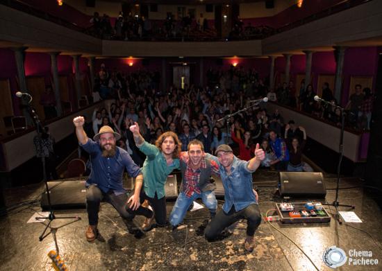 A estas alturas el público estaba totalmente entregado a estos cuatro grandes músicos, coreando sus canciones y saltando y bailando por el recinto.... Momento especial fue cuando Kike anuncio una colaboración especial, y presentaba con un gran cariño al músico reinosano Raúl Gutiérrez “Rulo” del grupo Rulo y La Contrabanda.... Lo cual hizo que la gente se pusiese en pie de nuevo, y emocionada brindara un caluroso aplauso a su paisano. Tras abrazarse con todos los componentes de Stock comenzaron los primeros acordes de “Cuantas veces”. Un gran tema que con las voces de Kike y Rulo perfectamente compaginadas, hizo las delicias del público. |