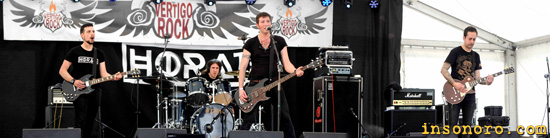 Hora 13 fueron los encargados de inaugurar el festival, allí vimos a su nuevo guitarrista por primera vez, listos para presentar los temas de su primer disco editado por Maldito Digital, “Anocheció”, que viene tras una primera maqueta en la que hicieron alarde de un metal melódico muy en la línea de los madrileños Sôber. 45 minutos tenían por delante, bien aprovechados y dando salida a un sólido sonido con temas donde sus estribillos mandas, cambios de ritmo constantes y grandes momentos de guitarra, con ciertos tintes góticos y melódicos más la gran carga emocional que tienen sus letras. Dejaron claro que tienen muchas ganas de presentar sus nuevos temas, también sacaron alguno de su primera maqueta y lo hicieron con mucha actitud ante la ausencia del público en la zona delantera, eso no condicionó para nada sus ganas de estar en el Vértigo Rock. Empezaron con “Cabaret”, que también abre su disco debut, siendo diez canciones las que tocaron en total con temática diversa, que si el amor, la separación o la reflexión. Registros de voz graduados con giros de velocidad rápidos, en un abrir y cerrar de ojos terminaron, no sin antes incluyendo en su set list los tres temas que aparecen como bonus track en su disco, “Una Palabras”, “Nada que Decir” e “Y Ahora Sí”, grabados inicialmente para su maqueta pero ahora con un mejor sonido, fuerza y solidez. “Ser O No Ser” cerró su concierto, ratificando el buen estado compositivo de la banda, y ahora les queda seguir peleando y recorriéndose los diversos garitos y salas de la zona. |