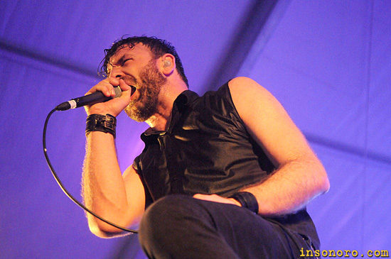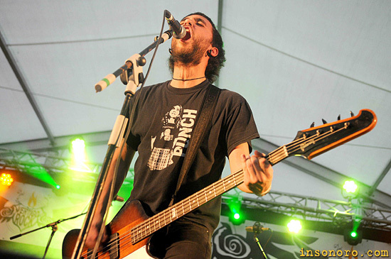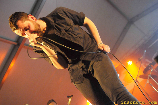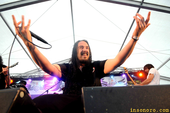 Llegó el momento de descansar, el escenario principal paraba durante una hora para dejar paso a Motxaila Band dentro de la carpa, animaron con sus versiones, pero nosotros decidimos ir a cenar unos bocadillos. A estas alturas el retraso se iba acumulando, pero las tres últimas más bandas que quedaban consiguieron ajustar su tiempo para cumplir en la mayor parte posible, los horarios. Continuaron los locales Insohmnio, que volvían a tocar en el festival tras sus actuaciones en el 2007 y 2010, esta vez lo hacían en la mejor hora de la noche, la organización les dio este privilegio, y realmente se lo merecen, llevan una década como formación, dos discos de estudio y una maqueta. Venían al Vértigo con un nuevo trabajo, “Stamina”, repleto de nuevas ilusiones y con las mismas ganas con las que comenzaron andadura, un regreso a los escenarios tras un parón donde su cantante, Aitor Cid, no ha estado quieto, lanzando un nuevo proyecto llamado Orihen. Sonidos de metal y melodías filosóficas, haciendo de este un concierto especial que contó con varias invitaciones, entre ellas la violinista Aida, que tocó con ellos uno de los temas nuevos, “Coca” como bien hizo en la grabación, también en el final del concierto se subieron al escenario Maialen, guitarrista de Orihen y Maialen Arrizabalaga, cantante de Stai Zitto, para apoyar en los estribillos en la última canción que tocaron, “Istorio Ederra”, que además es la única que en su disco cantan en euskera. Aprovecharon la ocasión para tocar todos los temas nuevos, en total son ocho, destacando “Mil Horas”, “Vigilia” y “Piratas”, quedando poco espacio para los cortes de su anterior disco, como “La Hora” con la que comenzaron o “Declive” en el ecuador de la actuación, ambas bien recibidas por seguidores y amigos. Insohmnio han vuelto de nuevo, este sería su primer concierto de la gira donde los nervios estuvieron presentes, ahora darán guerra, las pilas están cargadas!! |