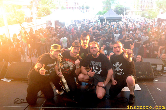 Los de Markina, A.D., tras más de una década como formación, llegaron al festival siendo una las bandas más destacadas de la noche, posiblemente sea el grupo con más proyección por estos lares, que de forma sigilosa crecen a su manera, y así, sin darnos cuenta, ya tienen tres discos y varios Eps. La autogestión es una realidad y si tienes convicciones claras de tu proyecto, los objetivos tarde o temprano se cumplen, primero el trabajo, meter horas en el local de ensayo, recorrerse Euskadi, entrar en festivales underground, gaztetxes, salas independientes como la Mogambo de Donosti.. acciones imprescindibles que A.D. saben y realizan. Estos sí que fueron arropados como se merecen, ante un público diferente que se acercó desde distintas localidades bizkainas y estuvieron frente a ellos desde el primer minuto, su sonido, el crossover fue el más salvaje y agresivo de toda la tarde noche. Once temas nos mostraron, supurando estados de rabia y reivindicación, hablando de conciencia social y humanidad dormida ante los hechos, empezando rápidamente con “Ira Infernal” y “Guerra”, para seguir dando brea con los temas de su nuevo disco con “Respira” y “Realidad”, que abren dicha obra llamada “Si Vis Pacem..” en el mismo orden. Hicieron gala de un sonido entero, directo y rápido, con un cantante llamado Igor que controló su espacio llevando la actuación a su terreno, no parando de moverse y gesticulando constantemente con brazos y manos, además de formar molinillos desenfrenados con su cuello y cabello. Pasando a poner el dedo en la llaga con “Dinero y Mentiras” o “Ley del Silencio”, más la diversión y sorpresa con la cover de Ángeles del Infierno “Maldito Sea Tu Nombre”, eso sí, llevándola a su terreno, volcando el lado más salvaje y melancólico de la banda de Lasarte. No fue la única sorpresa de la noche, invitaron a subir a varios amigos, Kapi de Ost se puso a la guitarra, Ian Mason de The Wizards a las voces, Txino de Storbais tambien a las voces y Ekaitz Garmendia de Legen Beltza, completando una superbanda que la liaron sobre el escenario, era como si cayese la bomba de Hirosima en plena calle. Luego les dio tiempo a tocar el último tema, “Titán”, desatando histeria y diversión colectiva tras esa fantástica reunión de amigos. |