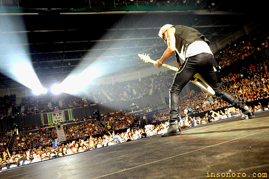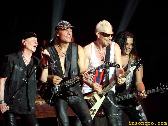 Entrábamos en la parte acústica con tres temas, Mikkey con un cajón, el cantante y sus dos guitarristas, sentados en sendos taburetes situados en la parte más cercana al público, “Delicate Dance”, la melódica “Send me an Angel” y el aclamado himno “Wind of Change”, para luego regresar con fuerza al eléctrico e interpretar el tercer y último de los temas nuevos, “Rock 'n ' Roll Band”. “Dynamite”, uno de sus temas más rockeros, nos dejó buenos y dinámicos riffs, recogiendo el batería el testigo dejado por los guitarristas, se marcó un solo dentro de uno de los momentos estelares de toda la actuación, la tarima de la batería se elevó para que la viese todo el mundo, las pantallas se sumaron a la fiesta sin perderse ningún detalle, y el humo hizo el resto, dejando un show impactante. La recta final tuvo un protagonista, su disco “Black Out”, pero antes las pantallas nos mostraron todas las portadas de la extensa discografía de estos alemanes, pero volvamos al concierto, “Black Out” disparó el humo de la guitarra de Rudolf Shenker, “No One Like You” también apareció a esta altura del concierto, al igual que la melosa y melódica “Big City Nights”, con esas imágenes proyectadas del videoclip con esas chicas contorsionistas o la noche en la ciudad. Y así terminaron, hicieron piña, se agarraron y se despidieron, pero aún faltaba la tanda de bises con dos últimas canciones, bajo el clamor popular, hasta las gradas se pusieron en pie cuando sonaron los primeros acordes de la balada conocida a nivel mundial, “Still Loving You”, también tocó la vena sensible su último cartucho, “Rock You Like a Hurricane”. Se volvieron a despedir mientras lanzaban baquetas y púas. Otros dinosaurios que crearon leyenda nos dejan, eso sí, esperamos que esta gira despedida sea la definitiva y no vengan con otras historias que les pongan de nuevo en la carretera, porque eso es engañar al público y no nos gusta nada ver estas cosas, algún día tendrán que colgar los instrumentos, digo yo, pese a quien pese. |