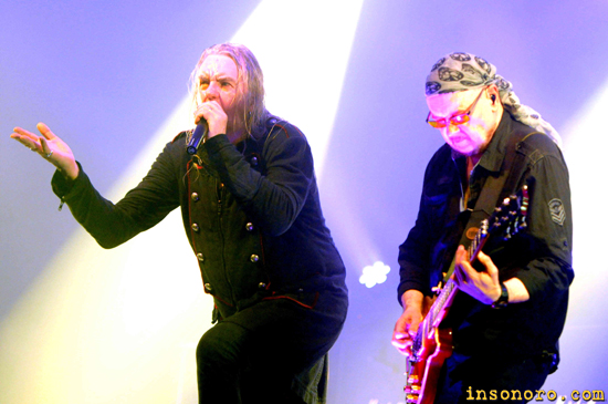 Minutos de espera para ultimar los últimos detalles y salida de Saxon dentro de esta emotiva gira, sobre todo a los que nunca les habían visto en directo en formato sala como quien dice, y es que años atrás pasaron desapercibidos cuando visitaron la RockStar Live de Barakaldo, son más de festivales tipo Metalway de Gernika o Monsters of Rock de Zaragoza. En esta gira Saxon sufrió no hace mucho la baja de su bajista Nibs Caster por problemas familiares, pero su lugar lo ocupa de forma fantástica Gus Macricostas de Battleroar, que junto con los guitarristas Doug Scarratt y Paul Quinn, más Nigel Glocker a la batería y la incombustible voz de Biff Bydor, forman actualmente Saxon, banda que mantiene viva la chispa de antaño. Set list donde los clásicos iban pasando de uno en uno, y es que resumir en un concierto 35 años de trayectoria es muy difícil, muchos discos, mucho heavy metal clásico, mucha música a la que nos rendimos en sus pies desde los primeros discos hasta los últimos, como “Battering Ram”, y ya esperando el próximo, el directo llamado “Let Me Feel Yout Power”. Por delante disfrutaríamos de 23 canciones, con esa unión y hermandad que caracteriza a los metalheads de la zona norte, gente de las zonas limítrofes y cercanas a Bilbao como Logroño, Santander, Asturias, Gasteiz o Donosti. “Battering Ram” de su último disco abrió la contienda, una fortaleza física que respira toda la banda en especial su cantante Biff, que en multitud de ocasiones saltaba e incitaba al movimiento al resto de sus compañeros. Una colección de himnos que nos animaban a cantar a ciegas, dígase “Heavy Metal Thunder”, “Solid Ball of Rock” o “Never Surrender”, comunión perfecta entre ellos y el público que solo se puede vivir en una sala de estas características, fortaleciendo dicho contacto a más no poder. “The Eagle Has Landed” con las primeras humaradas de humo, unos cañones que entraban en acción en las canciones más significativas, dando un efecto visual impresionante. Ya en el ecuador del bolo tuvo protagonismo su último disco de estudio con “The Devil’s Footprint” y “Queen of Hearts” donde los desarrollos son largos y modernos, con guitarras enriquecidas y es que tanto Dog como Paul son unos monstruos a las seis cuerdas. |