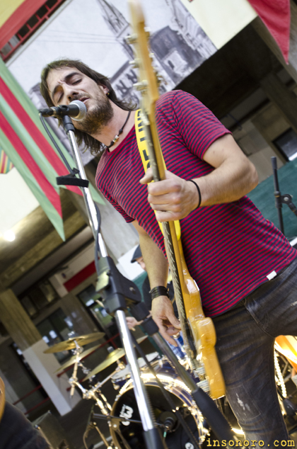 ADN sin duda, tienen la agenda a rebosar, una de las bandas cántabras que más toca últimamente por la región haciendo pequeñas visitas a provincias limítrofes, por eso, tarde o temprano nos volveríamos a reencontrar con ellos, y así fue, les volvimos a ver en un terreno distinto, en la Feria del Stock de Torrelavega situada en el Mercado de Ganados, allí, durante el fin de semana del 25, 26 y 27 de agosto, además de dicha feria, había música en directo, primero con ADN el viernes, luego 4 de copas el sábado y por último Roy Rio Trio el domingo. Nosotros nos acercamos a ver a ADN, que hacía un año justo que no les veíamos en directo (el que suscribe), cuando tocaron en las fiestas de Solares junto con La Fuga, y les vimos en forma, muy en forma, las últimas canciones compuestas del disco “El Último Viajero” están ya rodadas y lanzadas por un cuarteto muy pero que muy compenetrado, es más, el repertorio se le conocen de memoria, renunciando al típico set list que guía a todas las bandas. Nos sorprendió gratamente la gente que estaba esperando al inicio del concierto, pensábamos que sería un bolo más donde lo importante era la feria y la música estaría en un segundo plano, pero no, amigos, seguidores de la banda y mucha juventud, se quedaron observando su actuación de principio a fin. |