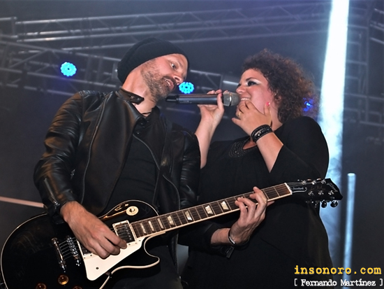 Y tras los consiguientes cambios, nuevamente hechos con rapidez, llegó el turno de Robin Beck y su banda, saliendo en primer lugar los integrantes de la misma, mientras ella comenzaba a cantar desde los camerinos, siendo el primer tema en interpretar “If you were a woman (And I was a man)”, esa pegadiza versión de Bonnie Tyler, que nuestra protagonista publicó en su segundo y exitoso segundo disco “Trouble or Nothin'” de 1989. Tras interactuar con el público desde el primer momento, siguieron en el mismo disco con “Don't lose any sleep”, una nueva versión, esta vez de John Waite, con un Jorge Salan, espectacular a la guitarra, y una Robin Beck que demostró conservar su voz en un excelente estado de forma, antes de que nos recordase que en el citado segundo disco contó con la colaboración de artistas como Alice Cooper que coescribió el tema “Hold back the night” junto al famoso compositor Desmond Child, un tema muy pegadizo y donde destacó el guitarrista Jimi Bell, miembro de House of Lords. En todo momento se mostró dialogante con los presentes, eso sí, en ingles, por lo que algunos nos perdíamos parte de sus discursos, siguiendo su repaso al citado y exitoso disco con “Sleeping with the enemy”, otro temazo de esos que da igual si le has escuchado previamente o no ya que se te va a quedar grabado si o si, antes de comenzar un bloque en donde presentaba su actual disco “Love is Coming”, del pasado año, en donde sigue demostrando que es capaz de realizar grandes temas como ese “Island”, que fue el siguiente en sonar. Tras preguntarnos si entendíamos inglés, debe ser que se notaba nuestro desconocimiento del idioma, llegó el turno de ese temazo que da nombre a su nuevo disco, “Love is Coming”, y que puede convertirse en un nuevo clásico de su discografía, antes de, siguiendo con el citado disco, interpretar “Me just being me”, en donde animaba a las mujeres a hacer lo que quisieran sin importarles lo que opinen los demás, siendo otro tema muy pegadizo. Tras saludar a una niña pequeña que estaba a hombres de su padre, llegó el turno de una nueva versión de Bonnie Tyler, también presentes en su segundo disco , la conocida “Save up all your tears”, que provocó una gran respuesta entre el público, antes de, no dejando este trabajo de 1989, interpretar la balada “Tears in the Rain”, con las partes de teclados grabadas, y que sirvió de presentación a los músicos que la acompañan: los citados Jorge Salan y Jimi Bell a las guitarras, su marido y productor James Christian al bajo y el batería B.J. Zampa, los tres últimos integrantes además de House of Lords. Precisamente B.J. Zampa fue el protagonista de la siguiente parte del concierto con un solo de batería siguiendo el ritmo de una música grabada, solo que fue corto y animado, antes de seguir con “That all depends (On what you do tonight)”, un pegadizo tema cantado a la par por Robin y James Christian, presentes en su disco del 2011 “The great escape” y que me gustó mucho. |