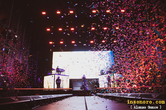Todo estaba dispuesto en el escenario: dos grandes cubos puestos en diagonal, sobre los que estaban colocados batería (derecha) y teclados (izquierda), que después comprobaríamos que funcionaban como pantallas además de como plataformas; la pantalla de forma rectangular en una altura media alta y unas escaleras con los filos iluminados por las que aparecerían los miembros del grupo español que quedaba justo en el centro entre los cubos citados. Tras media hora de espera y con un recinto que se había animado bastante, comenzó de forma puntual el concierto del grupo zaragozano. La primera en aparecer fue Eva (voz y guitarra) y lo haría bajando la escalera ataviada con una capa con capucha de gasa de color negro, mientras que iba sonando la intro del álbum “Dolce Vita” (2025). El siguiente en aparecer fue Juan Aguirre con su indumentaria habitual, gorra y pañuelo en el cuello. Tras saludar ambos, se sumaron los demás músicos que les acompañaron en el escenario sevillano y comenzó la interpretación del primer tema de la noche, “Dolce Vita” del álbum del mismo nombre y que estuvo bastante presente en el setlist de los zaragozanos. Eva se recorrió la pasarela que le aproximaba más al público durante su interpretación, una vez que se había desprendido de la capa de gasa, dejando ver un body negro de lentejuelas y una falda negra larga también de gasa ajustada a su cintura. Desde el inicio, el sonido fue muy bueno y las imágenes que acompañaron a este primer tema y que se dejaron ver tanto en la pantalla central del escenario, como en los cubos del batería y del teclista y como en las pantallas laterales del escenario, de una belleza extraordinaria con paisajes de naturaleza preciosos. En el segundo tema, “Eso Que Te Vuela la Cabeza”, nos sorprendieron con una lluvia de confetis de colores que lanzaron hacia el público en un par de ocasiones, para seguir con “Tal Como Soy”, en el que Eva se puso unas gafas de sol oscuras y en el que jugaría un papel decisivo el juego de luces con el que crearon un círculo en el que se reflejaban las siluetas de Juan y Eva mientras que interpretaban el tema. |