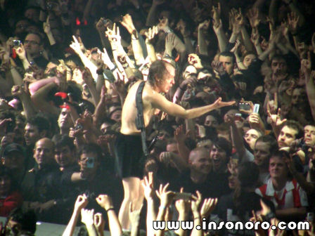 Poco antes de que la banda australiana AC/DC pisara el escenario, la visión era totalmente espléndida y alucinante, en la pista no cabía ni un alfiler y aunque en las gradas se contemplaba algún que otro sitio libre se podía escuchar las típicas discusiones “Hey tio, este no es tu sitio” y es que al final fue un total desbarajuste el poder controlar que cada uno ocupase su debido lugar. En un principio hubo empleadas que te indicaban cual era tu correcta ubicación pero supongo que se cansaron de que la peña no les hiciera caso. Quedaba apenas unos minutos cuando el público ya se empezó a poner nervioso y corear el nombre de la banda. Los situados en las gradas ya no aguantaron más y se pusieron definitivamente de pie para recibir como dios manda a tan venerada y alabada banda. A las diez de la noche se apagaron las luces y el espectáculo daba comienzo de una manera convincente y original, con una corta animación que fue proyectada por las pantallas, en la que una locomotora dirigida a todo trapo por Angus Young era saboteada por dos chicas atractivas, quienes fueron seduciéndole con sus encantos, logrando estrellar finalmente la máquina contra una vía muerta. En ese mismo instante comenzó una serie de explosiones sobre el escenario y entre el fuego y el humo, como si del infierno se tratará, fueron emergiendo los músicos, desatando las primeras ovaciones de los miles de asistentes. Un Angus, envejecido pero en un estado físico excepcional, fue el que tomó en un principio las riendas, arrancando valientemente el show con los primeros acordes de ”Rock ‘N’ Roll Train”. Un alarde de virtuosismo en el que sus típicos espasmos nerviosos a la hora de tocar a toda velocidad las cuerdas de su Gibson y su peculiar forma de recorrer el escenario captó inmediatamente la mirada del público. |