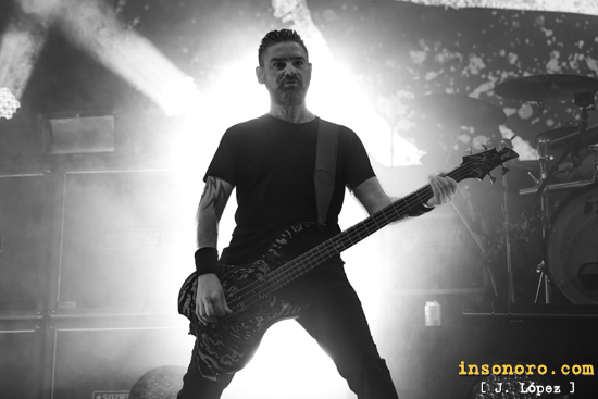 “Política del miedo” y “Polvo en los ojos” nos hacían volar por los aires con ese crossover poderoso que sale de las guitarras del veterano Jesús Jiménez e Íñigo Zubizarreta, quien desde que entró en la banda hace ya más de quince años, viene demostrando por qué es uno de los mejores guitarristas nacionales. “Colapso final”, reflejaba su actualidad musical. Desde luego, el set elegido estaba siendo atronador; sin duda, esta noche no era la elegida para los medios tiempos, nada de eso. Solo había sitio para la brutalidad absoluta.