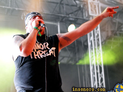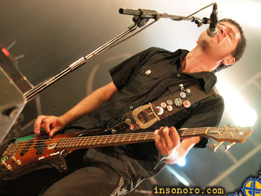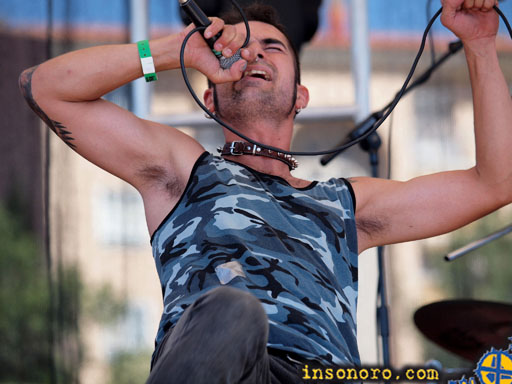 Por fin había caído la noche y el apabullante calor se desvanecía mientras nuestros cuerpos estaban preparados para empaparse de Kaótiko. Los de Agurain nos ofrecieron un concierto muy en la línea a las que nos tienen acostumbrados, es decir, cargado de grandes clásicos y de temas más novedosos, pero sobretodo de mucha energía, de pocas palabras y repleto de inconformismo y actitud. Esta banda no es mucho de dar discursos, pero sí de comentar varias veces que están muy a gusto. Es de agradecer y mucho que no aprovechen la ocasión para taladrarnos la mente, ya podrían aprender otros grupos, porque el soltar el mitin ideológico ya está más que desfasado, además para eso cuentan todos los que se suben a un escenario por el poder de sus letras. Varias veces comentó también Jhony que iban con la hora pegada al culo y que no sabían qué hacer, si tocar menos tiempo o si acelerar las canciones. Lo de la hora pegada al culo podría haber sido del todo literal, aunque habría estado un poco feo, ¡jejejeje!, pero casi lo fue. Y es que los que ya llevamos algo de tiempo haciendo el cabra por el escenario y sacando fotos, sabemos que cuando está Juantxu de Los Amanece Producciones, le suele acompañar inevitablemente un reloj colocado para que los actúan lo vean. A mí me parece totalmente lícito, y de hecho algunos festivales van cogiendo esta idea tan útil para conseguir que a los músicos no se les vaya la pinza y acaben tocando media hora más y retrasándolo todo. A pesar de ello Kaótiko tocó bastante tiempo (no sé si menos del que deberían porque la que no estaba atenta al reloj en esos momentos era yo, y como siempre se me pasó el concierto a la velocidad de un sputnik) pero sí lo justo y necesario para volvernos a enamorar. Empezaron el espectáculo con las novedosas y nada caóticas “Adrenalina” y “Quien manda aquí” correspondientes ambas a las dos primeras pistas de sus dos últimos discos respectivamente aunque del revés, como todos ya sabemos la primera pertenece a su penúltimo disco titulado de la misma forma, y la segunda al más nuevo, “Reacciona!!!”. Luego le llegó el turno a uno de esos temas añejos, que fue “Ansiedad”, el único que pudimos escuchar de Kaos Etíliko junto a otro que vino un poco más adelante, nada más y nada menos que “Su falso mundo”. Para seguir abriendo boca nos tocó una ración de “Alcoholemia”, aunque “Raska y pierde” fue el disco protagonista de la noche y el que más repartieron, empezando por “Paranoia” y “Sucio criminal”. Dos grandes temas que juntos pueden causar taquicardia, y de hecho no dejaron a nadie indiferente, y por eso tal vez Kaótiko los enlazó con la también genial pero algo más comedida “En el barrio de latón”. |