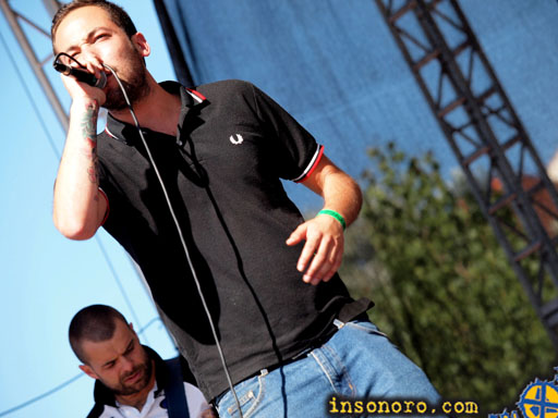 Y de nuevo volvimos a coincidir en un festival con los vallisoletanos Seiskafés, si, Seiskafés, ya sabéis que han cambiado la forma de escribir su nombre, atrás quedan los tiempos de 6eiskafés. Es época de cambios, su formación ha sufrido un par de bajas que fueron subsanadas de forma magistral, al bajo y al saxo. Ahora, con una formación estable, están a punto de editar su segundo trabajo, un disco que esperamos con muchísimas ganas, en los directos nos adelantan algún que otro tema y la verdad que la cosa tiene muy buena pinta. Ya son unas cuantas veces que hemos visto a esta banda en directo, pero curiosamente en todas menos una, ha sido de tarde e incluso de mañana como en el Derramerock, ¿Cuándo les veremos de noche? Pues espero que pronto, que no es lo mismo ver a un grupo cuando te pega el sol que al contrario. Empezaron al son de “Paga” canción a ritmo de ska, reggae, muy tranquila en su inicio pero demoledora al final. Entre los primeros temas hay uno que me llamó la atención, es la segunda vez que le escucho y me tiene completamente enganchado, no sé el título, pero si la temática, habla sobre “Dubai”, supongo que será de los nuevos como “Nikolai” y “Ska-k” que también los tocaron. Tampoco faltaron los éxitos de la banda como “Cantarranas”, dedicada a la Plaza del mismo nombre de Valladolid, lugar donde habitualmente se reúne la juventud los fines de semana!! , y “Que buena”. Hicieron una gran actuación, el único “pero” es que tocaron muy pronto, tan pronto que la manguera de agua tuvo que hacer horas extras para mojar al público y prevenir algún golpe de calor. |