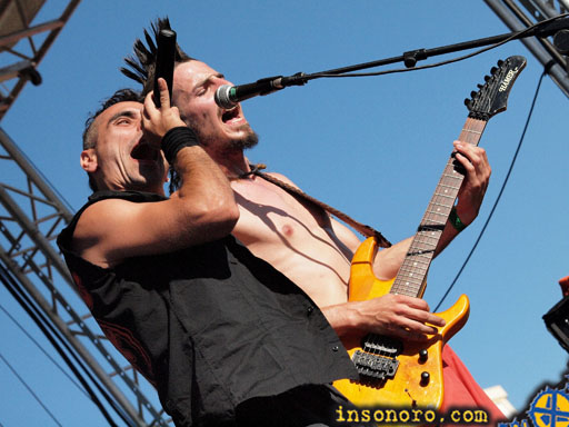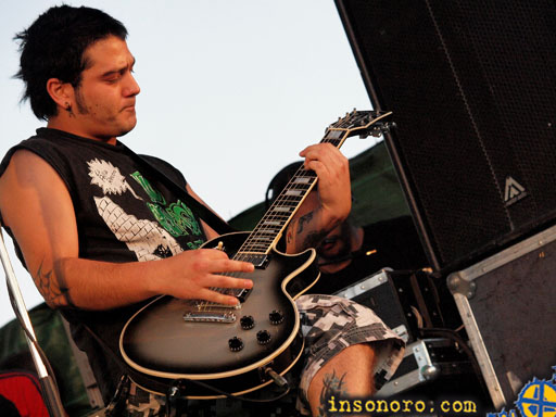 Llegaba el momento de la actuación del único grupo foráneo del festival, se llaman SK6 y para el que suscribe, eran unos completos desconocidos. Venían desde Lisboa (Portugal) a demostrar que en el país vecino se hace un buen punk rock / hardcore. Un nombre tan corto tiene que significar algo, lo de SK lo tengo claro, viene de skate, me baso en que parte de la banda se trasladó de las casetas del BackStage al escenario en skate, sancheski para los no iniciados o monopatín para los viejunos, además en su MySpace hay numeroso vídeos de esta actividad. Y lo de 6 pues que son 6 los componentes, pero no cuela, son 5, a lo mejor uno no vino, da igual, no merece la pena seguir con esto…. Lo primero que me llamó la atención fue que cantasen en su lengua natal, el portugués, uno está harto de ver grupos de otros países que cantan en inglés aunque ese no fuera su idioma, pues me alegré, sí señor. Comenzaron con “Sem Igual” que nos la despacharon rápidamente en dos minutos para dar comienzo a “ADM”, dos de sus mejores temas, se ve que querían convencer a la primera. Continuaron dando caña al respetable hasta que llegó el momento fatídico, el momento que todo batería no quiere que llegue nunca, el parche del bombo se rompió. Fue una faena ya que las actuaciones se vieron interrumpidas durante 20 minutos, menos mal que la buena gente de Seiskafés les prestaron el suyo. Estas cosas suelen pasar accidentalmente, no te lo esperas, pero una vez en casa y vistas las fotos que hicimos a la banda, se ve claramente que el parche estaba en las últimas y que era cuestión de minutos que la cosa petara. Un pequeño tirón de orejas para SK6, pero si vas a salir de gira y participar en un festival con los horarios justos, que menos que vayas con el equipo de gala. Cortaron su repertorio, no les quedaba otra, y cuando volvieron la gente se apagó un poco, una lástima. A mí me gustaron, tienen un ritmo rápido y contundente. He de decir, que el tiempo que se perdió entre el cambio de bombo se fue recuperando poco a poco, hasta que llegaron Narco, pero eso es otra historia. |