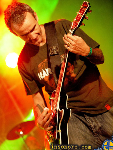 Con algo de retraso aparecieron los Narco sobre el escenario del Islarock. Se les esperaba para la hora a la que la Cenicienta debía volver a casa, sin embargo, algunos pensaban que miraban el reloj en Canarias o algo de eso. Como ya se comentó al principio de esta crónica los motivos del retraso no fueron intencionados ni quisieron crear expectación ni van de estrellas ni nada por el estilo. Lo único que pasó es que tuvieron problemillas de última hora, nada más ni nada menos. Yo me moría de ganas por verles y estaba hasta nerviosa. Si se me permite que escarbe en mi memoria, todavía recuerdo con añoranza cuando allá por el año 2001 alguien me regaló aquel “Talego pon pon” con algo de retraso pero con la mejor de las intenciones y diciéndome: A ver si te gusta esto, ¡y vaya que si me gustó!. El tiempo ha pasado para todos para bien o para mal, pero sin duda alguna es más que un lujazo poder seguir disfrutando de esta banda a pesar de que se hayan sucedido unos cuantos años y hayamos tenido que vivir momentos de incertidumbre. Tal vez aquel periodo de tiempo en el que reinó el silencio pesase como una losa para muchos, para otros no hizo más que avivar el deseo, y por eso este “Alita de mosca” que están presentando suena más vivo y fresco que nunca. Lo que no se puede negar es que con tiempo de por medio o sin él, este disco es de lo mejorcito que ha visto la luz este año y por qué no decirlo seguramente pasará a la historia como un imprescindible dentro de su estilo. Para mí era la primera vez que les veía presentando este nuevo disco, a pesar de que ya tocaron en el Derrame por ejemplo, pero en esa ocasión estaba ya más que dormida, así que estaba tan expectante que ya no sabía ni qué hacer mientras esperaba a que saliesen los sevillanos. Cuando la tensión se mascaba en el ambiente, por fin comenzaba a sonar la “Intro” del disco, esas niñas desconsoladas gritando como locas por que iba a desaparecer su grupo favorito. ¡Bien, bien, la tormenta era inminente!. La banda se centró en este “Alita de mosca” ofreciéndonos una buena muestra del mismo. Tras la primera intro siguieron el orden establecido y se tocaron del tirón los cinco temas que vienen después, y que como ya sabemos son “El narco”, “Sotanico”, “Son ellos”, “La última cena” y “Estrellas en el pecho”. Si cuando escuchas el disco se te ponen los pelos como escarpias en vivo es como para echarse a llorar de alegría, ¡madre mía vaya espectáculo!. Todas y cada una de las nuevas me parecieron brutales, tal vez “El narco” me impactó más porque la tenía más trillada y me acordaba más de ella, pero ningún tema se queda cojo o fuera de la altura de las circunstancias. Después de esta gran incursión en lo más reciente hicieron acopio de los clásicos, dejando sonar ese “A tomar por culo el mundo”, que creo recordar que fue lo único que desparramaron de su personal “Chaparrón de plomo” junto a “Vizco”, entremedias nos esperaba la todavía más mítica “Siempre enmaronao”. |