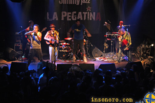 La Pegatina visitó recientemente Vitoria con su “Mira Que Mira Tour”. La rumba, la alegría, el buen rollo y el mestizaje estuvieron presentes durante las dos horas de concierto que ofreció la banda catalana en la Sala Jimmy Jazz. El fenómeno La Pegatina, que se formó en el año 2003 y que cuenta con dos discos de estudio publicados, más de 400 conciertos en once países y millones de descargas en internet, llegó a Vitoria el pasado viernes 1 de octubre con la intención de hacer vibrar y divertirse al público gasteiztarra. Cuando pasaban escasos minutos de las 22 horas, y mientras sonaba la intro, hicieron aparición sobre el escenario los siete miembros de La Pegatina: Rubén (voz y guitarra), Axel (trompeta), Romain (acordeón), Adriá (voz y guitarra), Ovidi (percusiones), Sergi (batería) y Ferran (bajo). Desde el comienzo de la actuación y hasta el final de la misma el ritmo del show no descendió, y fueron encadenando una y otra canción sin parar ni un instante. Intercalaron temas de sus dos álbumes “Al Carrer” (2007) y “Vía Mandarina” (2009) e incluso presentaron alguna canción nueva, como el tema en euskera “Jai eta Dantza”, la cual se incluirá en el tercer disco de estudio de los de Montcada i Reixac. Para la composición de este corte, contaron con la ayuda de buena parte de los seguidores que La Pegatina tiene en Euskadi, quienes, vía internet, se encargaron de dar forma a la letra. |