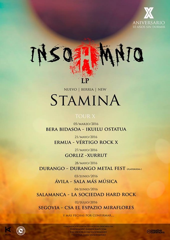 Nuevo trabajo de la banda de Ermua Insohmnio llamado "Stamina", el tercer disco a sus espaldas, compuesto por ocho canciones grabadas y masterizadas en los Koba Estudios por Xanpe, de las cuales siete son en castellano y una en euskera. Con este trabajo la formación gipuzkoana vuelven a salir a la carretera, con su cantante Aitor Cid compaginando labores con su otra banda llamada Orihen.