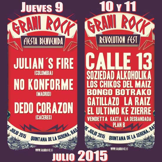 La segunda edición del GraniRock de Quintana de la Serena, municipio de la provincia de Badajoz (9, 10 y 11 de julio), pisa fuerte confirmando este año en su cartel con grupos de gran talla internacional como son Calle 13, o grandes pesos nacionales como Gatillazo o Soziedad Alkohólika. Hablamos con la organización para que nos cuente como es el Grani Rock en primera persona.