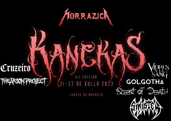 A falta de seis bandas más por anunciar, el cartel del Kanekas en su XII edición de los dÃas 21 y 22 de julio en Cangas do Morrazo, va quedando de la siguiente forma: Vidres a la Sang (Barcelona), Cruzeiro Doom (A Coruña), The Arson Project (Suecia), Scent of Death (Ourense), Golgotha (Mallorca) y Sinister Official (Holanda)