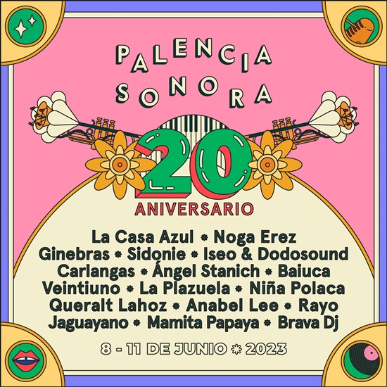 Así queda de momento el cartel de nuestro XX Aniversario con siete confirmaciones sonoras para empezar el verano en Palencia Sonora: Noga Erez, Ginebras, Carlangas, La Plazuela, Anabel Lee, Rayo y Mamita Papaya