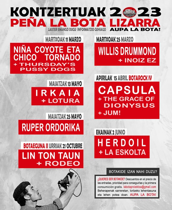 Próximos eventos de la Peña La Bota de Estella/Lizarra, en las próximas semanas veremos a Niña Coyote eta Chico Tornado, Willis Durmmond, Capsula...