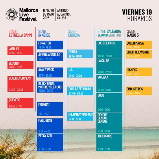 El evento musical más importante de las Islas Baleares presenta los horarios de su próxima cita, que tendrá lugar los dÃas 18, 19 y 20 de mayo en el Antiguo Aquapark de Calvià . Habrá un total de 5 escenarios: Escenario 1- Estrella Damm; Escenario 2 - INNSIDE by Meliá; Escenario 3 - ENDESA (patrocinador sostenible del festival); Escenario 4 - Baleà ria y Escenario 5 - Radio 3.