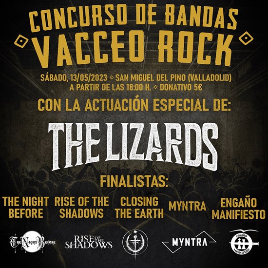 El sábado 13 de mayo se celebrará la final del Concurso de Bandas Vacceo Rock en San Miguel del Pino, Valladolid, con la actuación especial de The Lizards. Los finalistas son los siguientes.