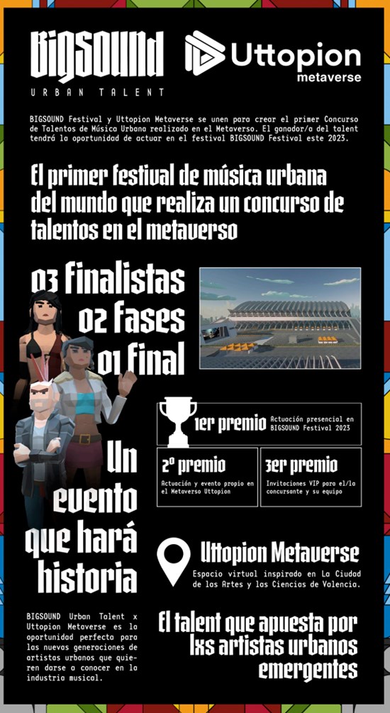 Uttopion, el primer metaverso español, y Bigsound, el mayor festival de música urbana, crearán el primer Talent de música urbana que se llevará a cabo en julio en La Ciudad de las Artes y de las Ciencias de Valencia. Más info en bigsoundurbantalent.com