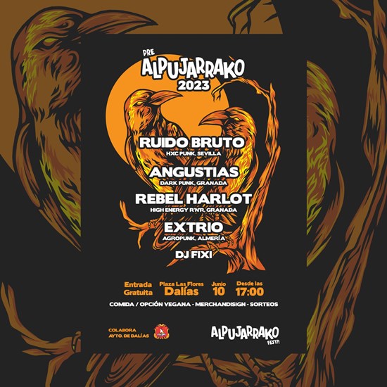Pre Alpujarrako Fest 2023 para el 10 de junio, con Ruido Bruto, Angustias, Rebel Harlot, Extrio y DJFixi. En la Plaza de Las Flores, DalÃas (AlmerÃa). Entrada gratuita