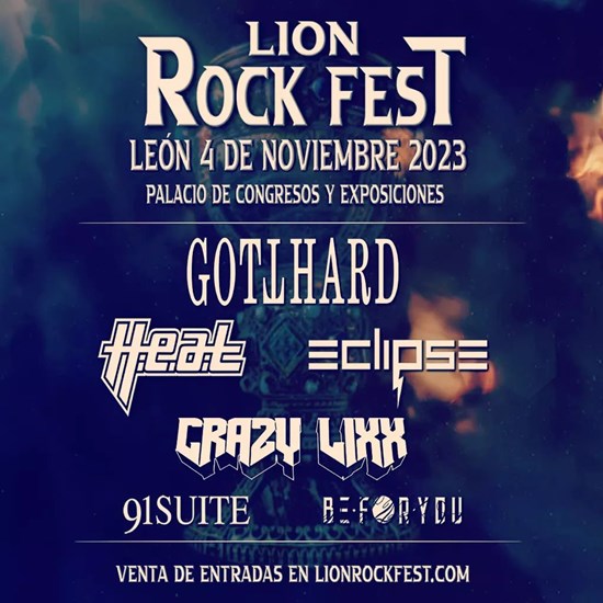 Cartel completo del Lion Rock Fest del 4 de noviembre en el Palacio de Congresos de León, con Gothatd, Eclipse, H.E.A.T., Crazy Lix...