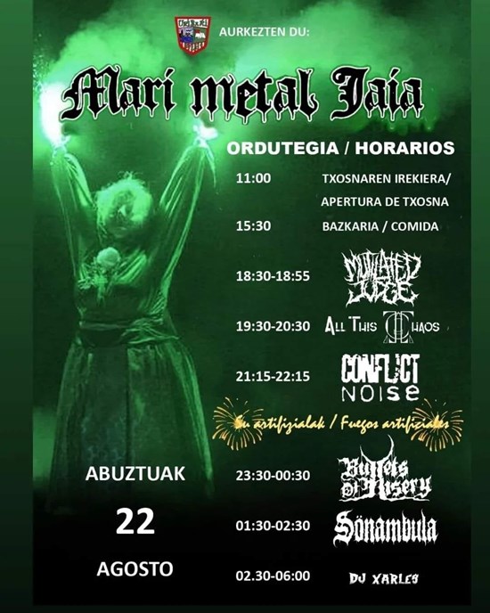 Horarios del Mari Jaia Metal del próximo 22 de agosto en la Konpartsa de Uribarri (Puerta Iglesia San Nicolas) en plenas fiestas de Bilbao