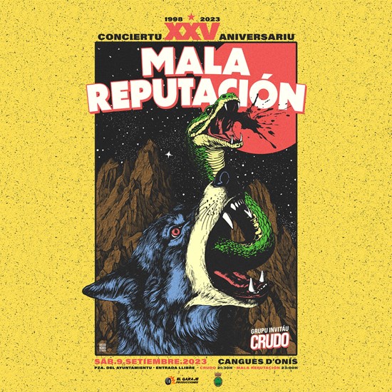 Mala Reputación celebrará su XXV Aniversario el 9 de septiembre en casa, en Cangues d`OnÃs, será una fecha especial y única, con un repertorio único para repasar los 25 años de la dilatada carrera de los asturianos. Crudo será la banda invitada. El concierto empezará a las 21:30 H. y es de acceso libre, además, por las calles de dicha localidad y desde ese dÃa hasta finales de septiembre, habrá una exposición que repasará la historia de la banda con 11 paneles con fotos y textos gracias a la Asociacion El Buxu