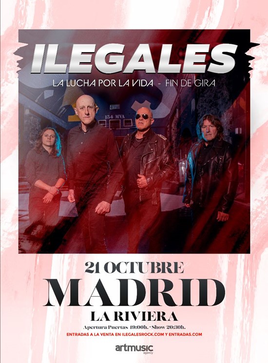 El próximo sábado 21 de octubre a las 20:30h Ilegales aterrizarán en la Sala La Riviera de Madrid, para realizar el último de los tres conciertos que significarán el fin de gira de "La Lucha por la Vida" en España. Las entradas para este concierto están a la venta a través de la plataforma entradas.com