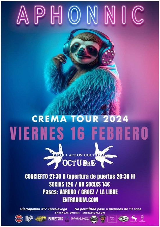 Este viernes, arranca la nueva gira de Aphonnic donde estará presentando su disco "Crema", lo harán en la Asociación Cultural Octubre de Sierrapando, Torrelavega, Cantabria, 20:30 h apertura de puertas y concierto a las 21:30 h. 12 euros para los socios y 14 euros para los no socios