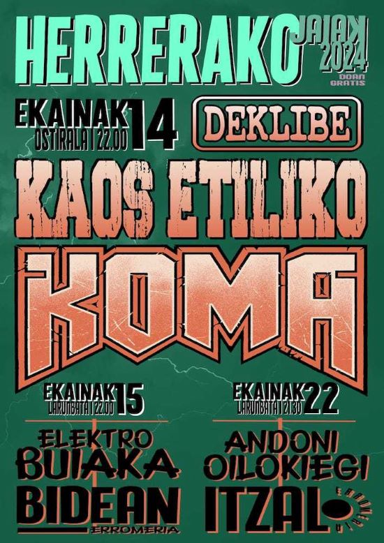 Koma y Kaos Etiliko comparten cartel en las fiestas del barrio de La Herrera de Donosti el viernes 14 de junio