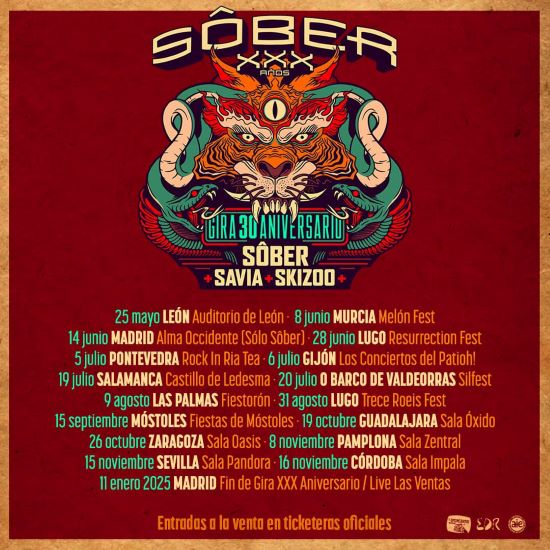 Ya están a la venta las entradas para el segundo bloque de fechas de la gira de los madrileños Sôber donde están celebrando su XXX Aniversario. Más info en la web oficial de la banda