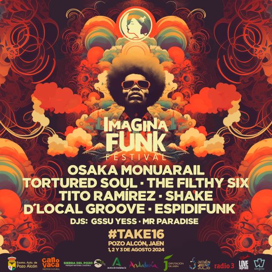 Cartel completo del Festival Imagina Funk en Pozo Alcón (Jaén) los dÃas 1,2 y 3 de agosto, con los británicos The Filthy Six y la banda canaria D´Local Groove se suman a los japoneses Osaka Monaurail, a los neoyorquinos Tortured Soul y a las grandes propuestas nacionales Shake, Tito RamÃrez y Espidifunk. Si todavÃa no tenéis vuestro abono