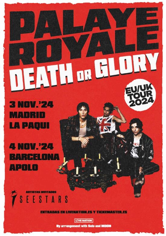 El electrizante trío de Los Ángeles, Palaye Royale, anuncia dos conciertos en España con Death or Glory Tour. Actuarán el Madrid el 3 de noviembre en La Paqui y el 4 de noviembre en Barcelona en Apolo. Entradas a la venta: el viernes 5 de julio a las 10h en Livenation.es y Ticketmaster.