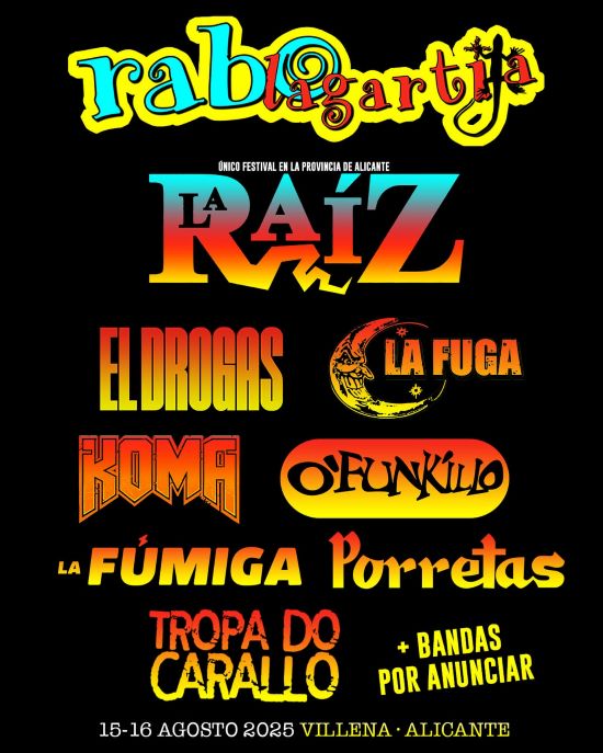 El Drogas, La Fuga, Koma, OFunkillo, La Fúmiga, Porretas y los Tropa do Carallo del mÃtico Evaristo Páramos (La Polla Records) se suman al cartel de Rabolagartija 2025, encabezado por La RaÃz, en su vuelta a los escenarios y como única fecha en vivo en un festival en la provincia de Alicante.