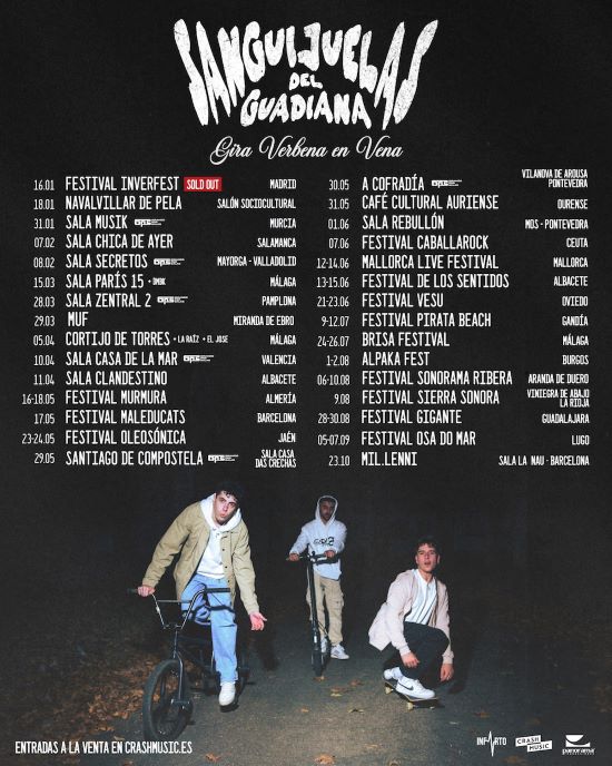 Sanguijuelas del Guadiana comienza el año con el anuncio de más de 20 fechas nuevas en su gira. La banda que prepara su concierto en Madrid del próximo 16 de enero dentro del ciclo Inverfest, colgó el segundo sold out en la capital en menos de un mes. Después de agotar las entradas de su primer concierto en tan solo 15 minutos el pasado 7 de noviembre en Sala Intruso.