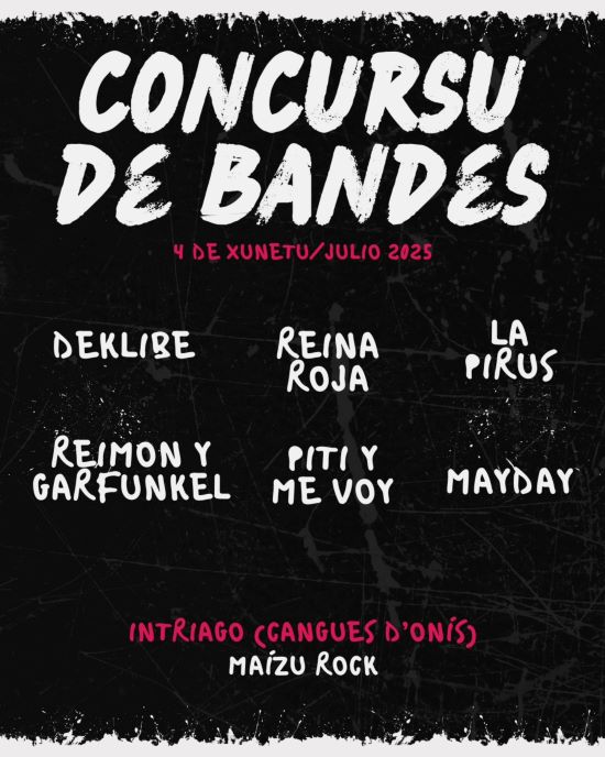 Estas son los grupos que participarán en el Concurso de Bandas del Maizu Rock de Cangas de OnÃs de este verano: Deklibe, Reina Roja, La Pirus, Reimon y Garfunkel, Piti y Me Voy y Mayday.