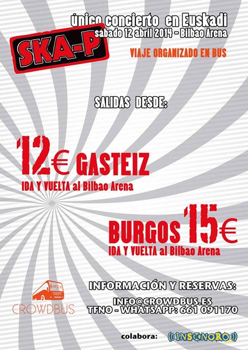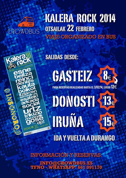 Crowdbusestá organizado viajes a la tercera edición del Kalerarock del 22 de febrero en Durango, Bizkaia (Boikot, Reincidentes, Urt, Esne Beltza...). Los viajes tendrán salidas desde Vitoria (8€), Donosti (13€) y Pamplona (15€). Toda la información sobre los mismos a continuación. Más info en info@crowdbus.es. Tambien preparan uno para Ska-p 12 de abril en Bilbao, con salida desde Vitoria y Burgos: