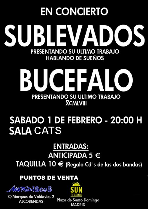Como la Sala Caracol sigue cerrada, el concierto de Sublevados y Bucefalo del sábado 1 de febrero, pasa a la Sala Cats, también en Madrid. Los horarios y las entradas siguen siendo las mismas. 20:00 h. La Sala Cats se encuentra en la calle JulÃan Romea número 4. Entrada anticipada 5 € en Mordiscos y Sun Records, 10 € en taquilla con regalo de cd´s de las dos bandas: