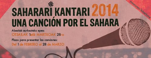 El pasado 1 de febrero se abrió el plazo para participar en el concurso musical "Una canción por el Sahara", concurso que pretende acercar la realidad del conflicto del Sahara Occidental y la situación del Pueblo Saharaui a los colectivos musicales jóvenes de Euskal Herria. Las bases y el resto de información en la web de Sahara Kantari.