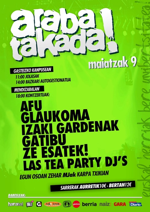 Hace unos dÃas fue la presentación de una nueva edición de la Arabatakada. La edición de este año tendrá lugar el próximo viernes 9 de mayo en Mendizabala (Vitoria-Gasteiz) y en ella participarán los siguientes grupos: Afu, Galukoma, Izaki Gardenak,Gatibu, Ze Esatek y Las Tea Party Dj´s. Las entradas tendrán un precio de 10 € Ant./ 12 € Taqu. Este será el programa de este año y el cartel: