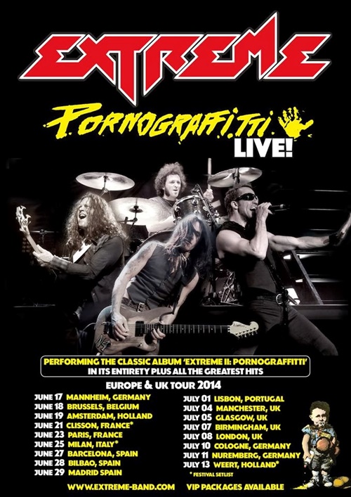 Eldorado será la banda que acompañe a Extreme en su próxima visita por el mes de junio, recordamos las fechas: 27 de junio en la sala Razzmatazz (Barcelona), 28 de junio en la sala Santana 27 (Bilbao) y 29 de junio en la sala La Riviera (Madrid). Las entradas están a la venta en los puntos habituales: red de Ticketmaster: Fnac, Carrefour, Halcón Viajes, Tiendas Tipo, etc. Por internet en www.ticktackticket.com. Por teléfono en el 902 15 00 25.