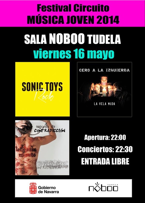 Esta noche se celebra el Festival Circuito Joven en la Sala Noboo de Tudela (Navarra) con Cero a la Izquierda, EspÃritu de Contradicción y Sonic Toys. Gratis. 22:00 h: