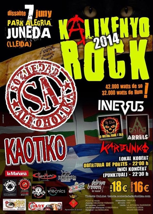 Este sábado llega una nueva edición del festival Kalikenyo Rock, cargado de buena música, por el escenario desfilarán bandas como Kaotiko, Soziedad Alkoholika, Inversus, Karbunko, Arrels y el Dj Lluis. La cita a partir de las 22 horas en el parque Alegría de Juneda (Lleida). 16€ anticipada y 18€ en taquilla. Las entradas están a la venta en los siguientes puntos: