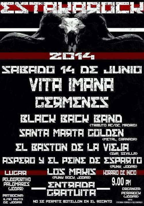 La Asociación Peñarock y sus Derivados con el patrocinio del Ayuntamiento de Jódar (Jaén) organiza, este sábado, una nueva edición del EstakaRock, en el Polideportivo Palomares de Jódar (Jaén), en el que actuarán Vita Imana, Germenes, Black Back Band, Santa Marta Golden, El Bastón De La Vieja, Apero Y El Peine De Espartoy Los Makis. 21:00 horas Entrada gratuita.