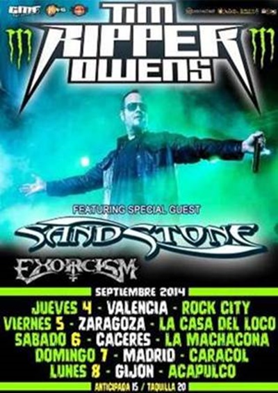 Sand Stone y Exorcism acompañarán a Ripper Owens (ex cantante de Judas Priest, Ice Earth e Yngwie Malmsteen) en su próxima visita en el mes de septiembre. que a las cuatro fechas que ya conocÃamos (Valencia, Zaragoza, Cáceres y Gijón), sumamos una quinta en Madrid. Fechas: