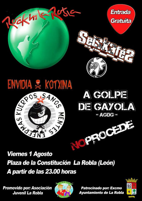 El próximo 1 de agosto tendrá lugar en la plaza de la constitución en la localidad de La Robla (León), el Rock in La Robla, con las actuaciones de A Golpe de Gayola, No Priocede, Seiskafes y Envidia Kotxina. 23:00 horas Entrada gratuita