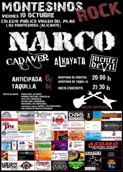 Hoy 10 de octubre, el Colegio Virgen del Pilar de Los Montesinos, Alicante, acogerá una nueva edición del Montesinos Rock con CA.DA.VER, Alkayata, Mente Devil y Narco. 20:00 h apertura de puertas, los conciertos empezarán a las 21:30 h. Entrada anticipada 6€. Entrada en taquilla 8€. Cartel y puntos de venta